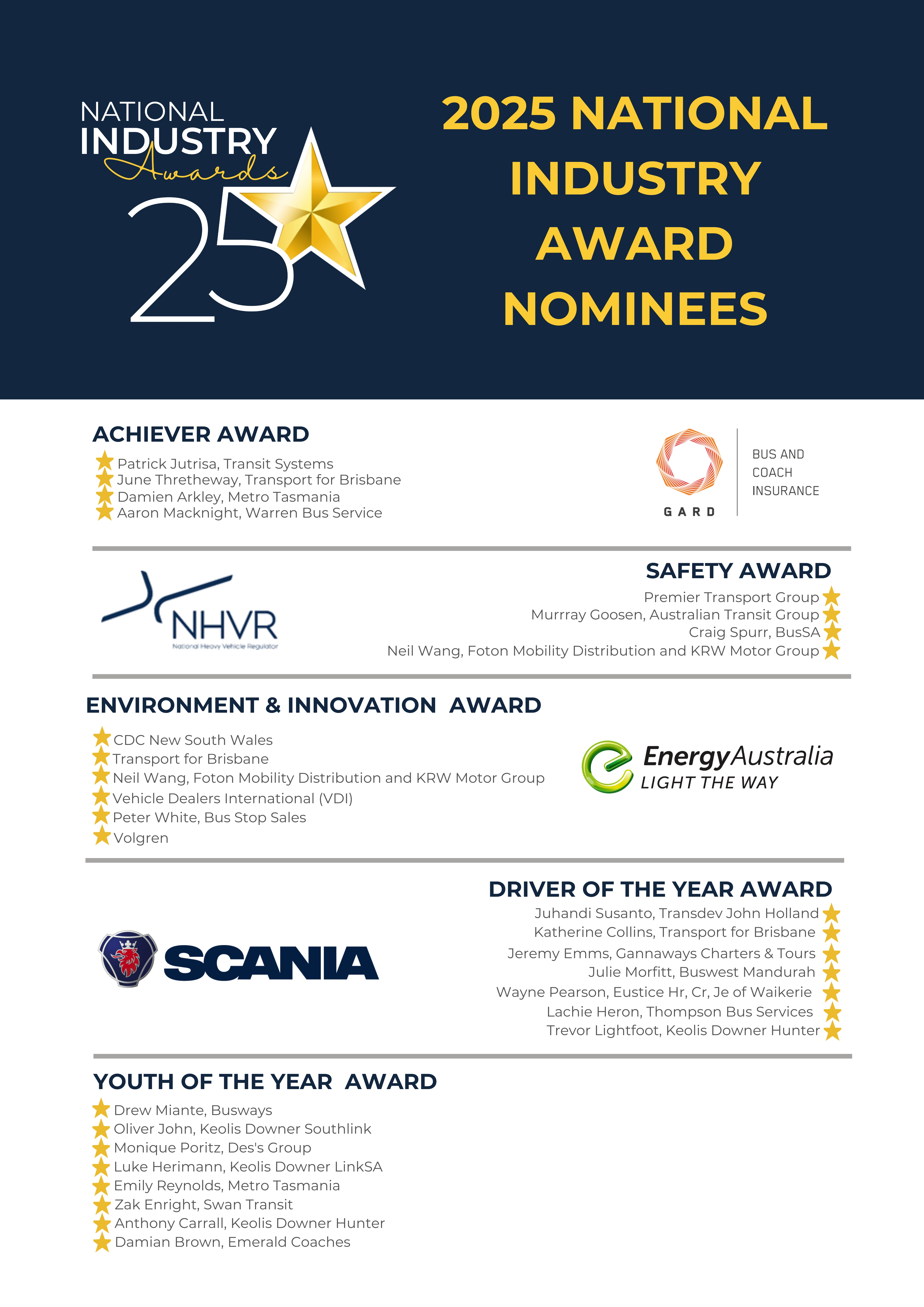 The National Industry Awards are an opportunity to recognise and reward excellence within the Australian Bus and Coach Industry.